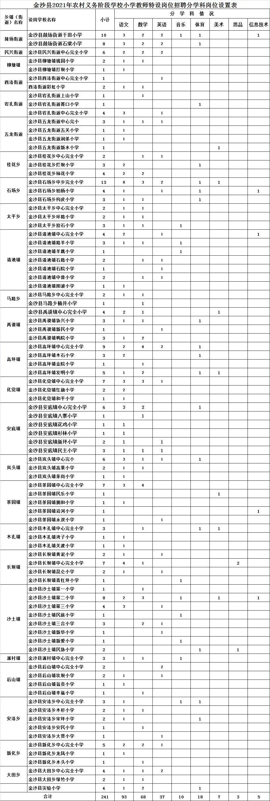 2、金沙县2021年农村义务阶段学校小学教师特设岗位招聘分学科岗位设置表