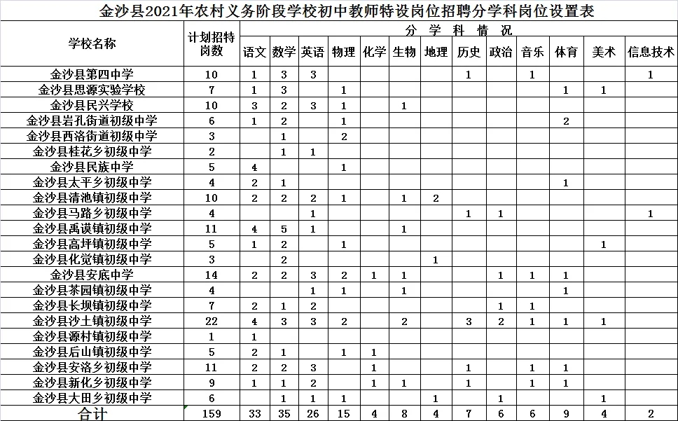 1、金沙县2021年农村义务阶段学校初中教师特设岗位招聘分学科岗位设置表